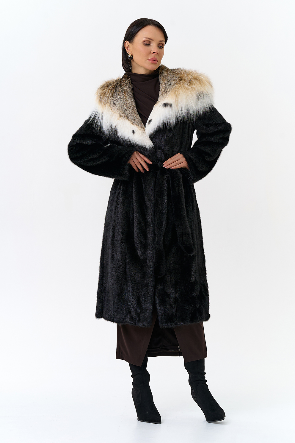 Норковая шуба с капюшоном с отделкой из рыси